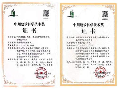 鄭州城建集團(tuán)的“擴(kuò)體預(yù)制樁—帷幕一體化支護(hù)結(jié)構(gòu)工作機(jī)理研究與應(yīng)用”與“新型裝配式樁板道路結(jié)構(gòu)工作機(jī)制與關(guān)鍵技術(shù)研究及工程應(yīng)用”兩項科研項目,分獲河南省“中州建設(shè)科學(xué)技術(shù)獎”特等獎和一等獎。